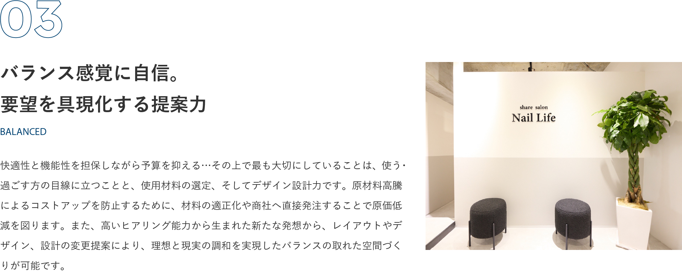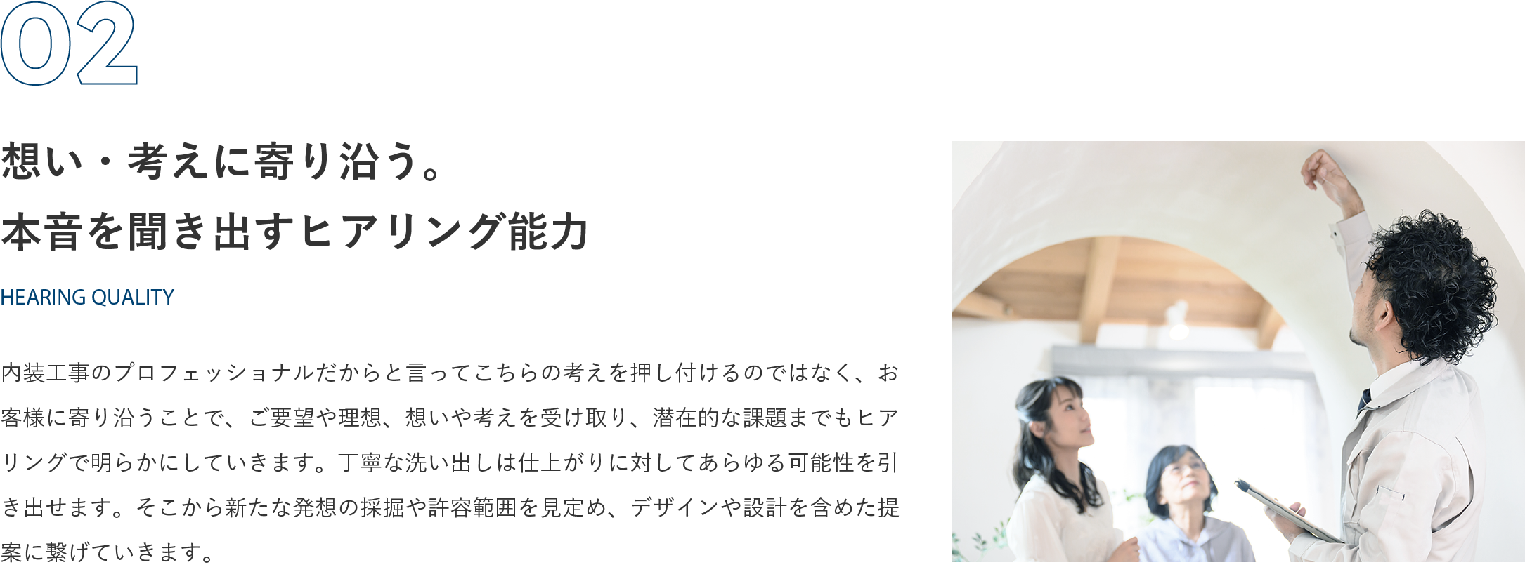 私たちが特に丁寧に取り組んでいるのが、リスクヘッジ。予算・工期・機能性・近隣配慮・仕上がりキレイが当たり前を守りながらも、お客様が思い描く理想に私たちがどれだけ近づけることができるか。日々精進しています。